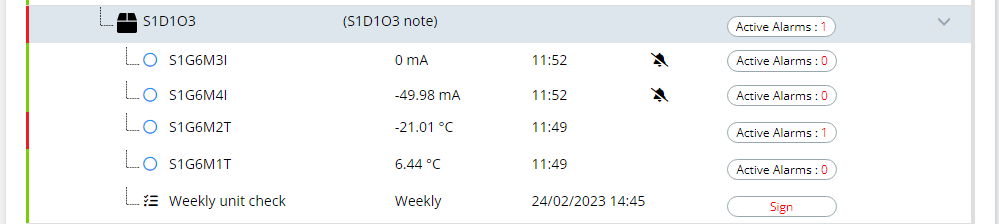 Punktami pomiarowymi w tym obiekcie są 2 czujniki temperatury, których nazwy kończą się na T i 2 wejścia prądowe, których nazwy kończą się na I oraz wirtualny punkt pomiarowy S1G6M2T Average. Ich nazwy znajdują się na górze, pod nazwą obiektu.