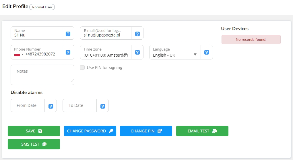 Kliknij przycisk “SMS TEST”, aby wysłać testową wiadomość SMS do użytkownika. Wyświetli się potwierdzenie.