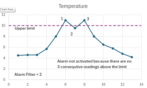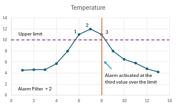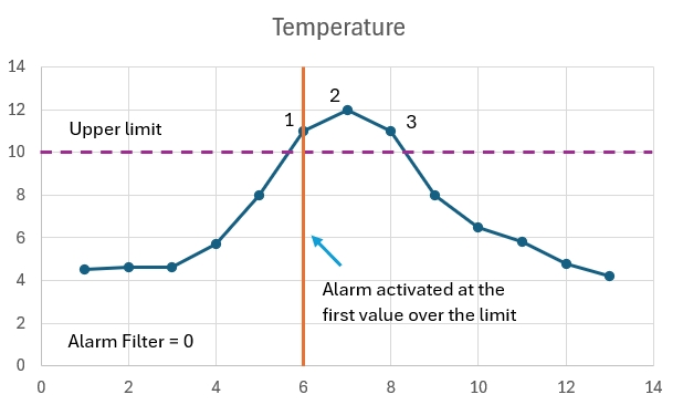 The Alarm Filter can be defined as a number of consecutive readings beyond a limit, that must be registered before the alarm detection will be activated.