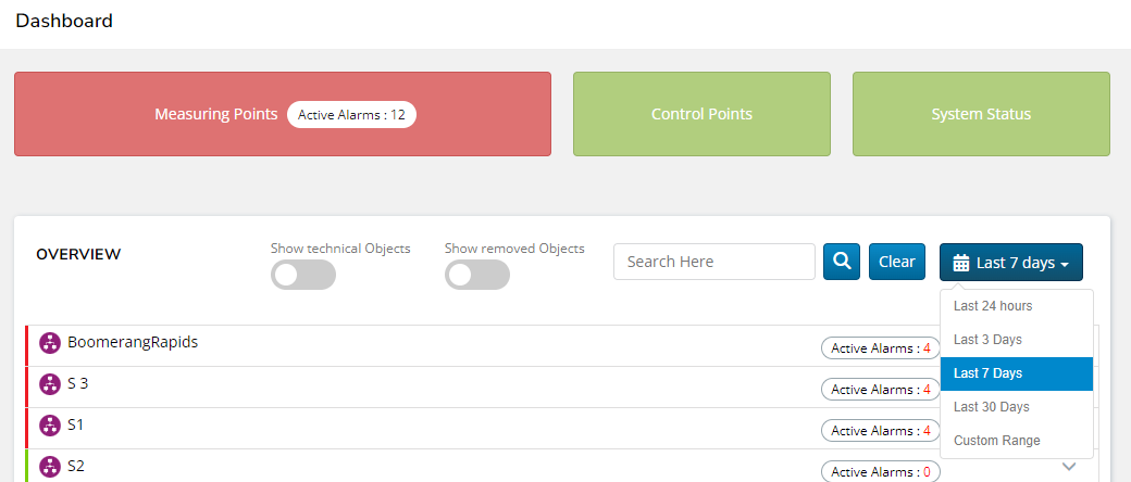 Click the view time interval button in the upper right corner of the Overview section, to select the display time range. The text on the button depends on the time range selected. The default value is ‘Last 7 days’.