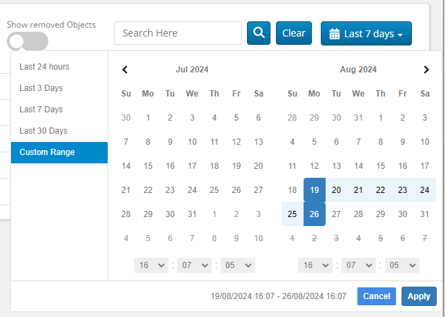 You may select ‘Last 24 hours’, ‘Last 3 days’, ‘Last 7 days’, ‘Last 30 days’ or ‘Custom Range’.